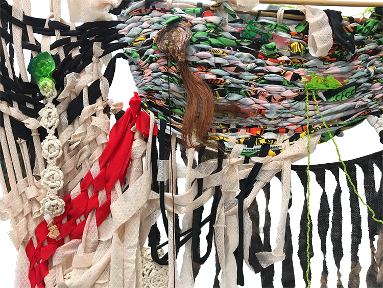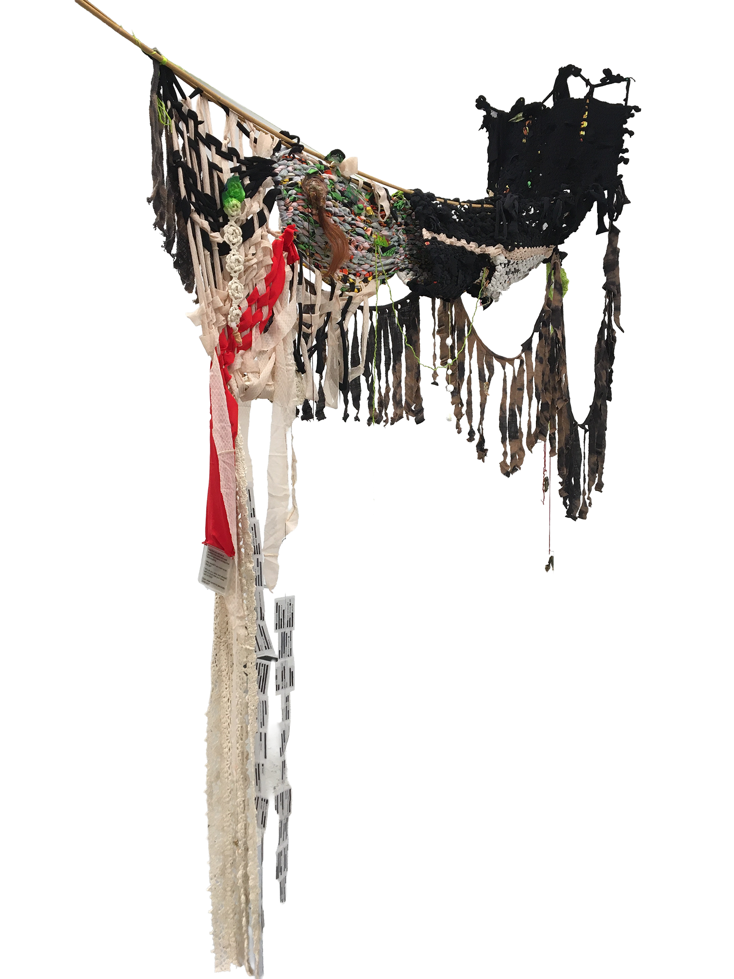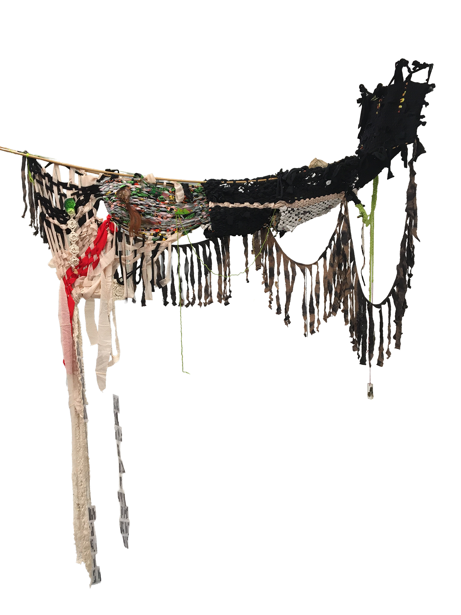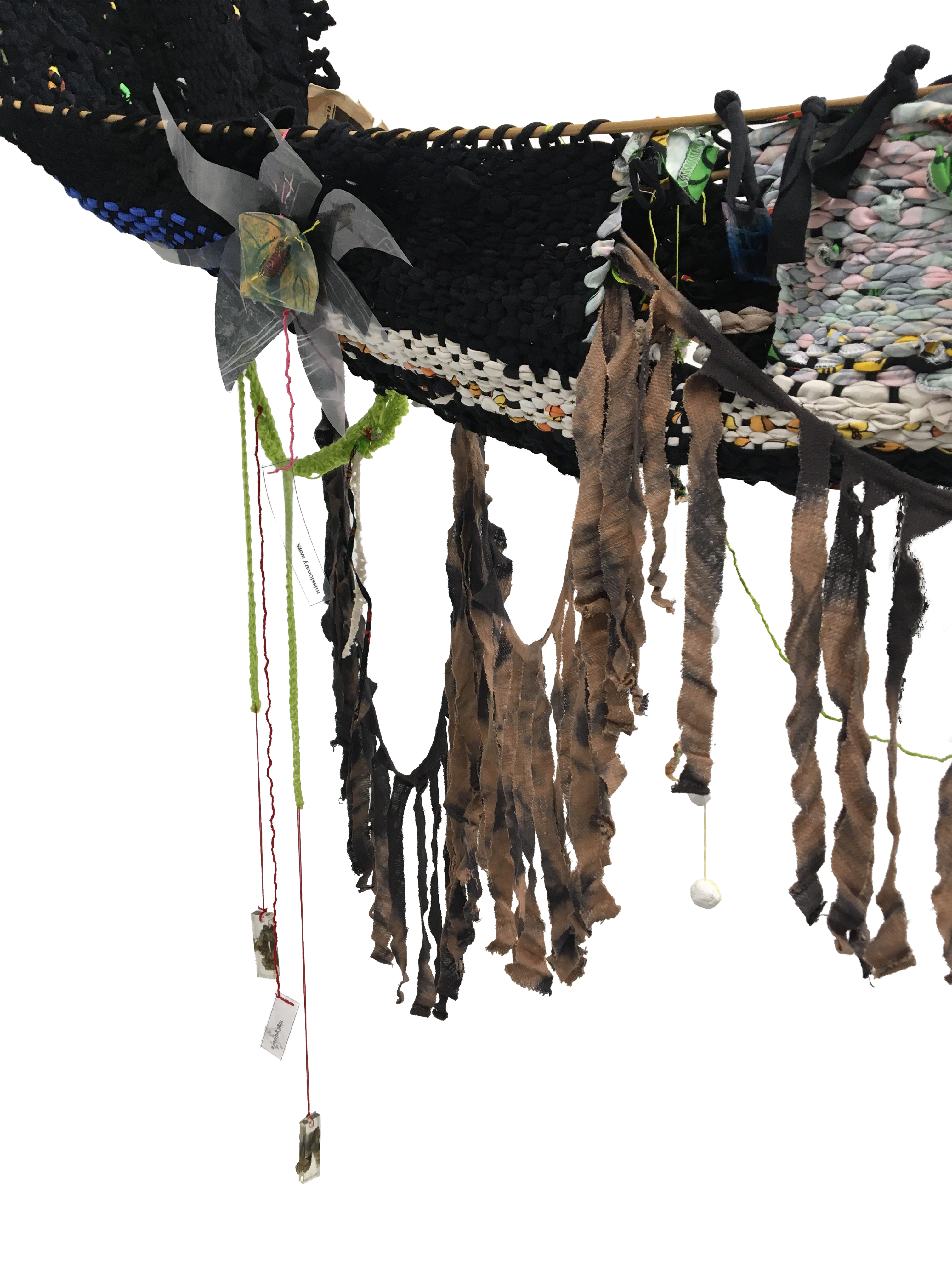 Media hoarding ephemera combine with the handiworks to create a net, a web, a collapsed sail; a dual personality, social enclosures woven together in a mapping of the Jekyll & Hyde syndrome symptomatic of the structural instability.